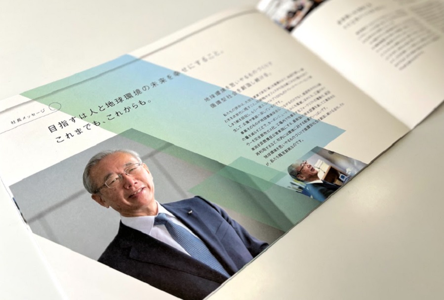 パンフレットの冒頭には、「人と地球環境の未来を幸せにするために」というコピーを使用し、そのあとには「同時に鶴見製紙が大事にしてきたのが、働く環境づくり」と今回のメッセージの根幹である「2つの”環境”」についてまとめました。