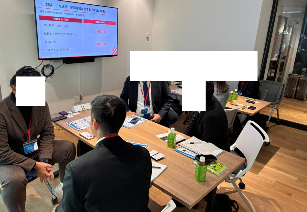 内定者フォローの仕組みから入社後の若手社員の軸確立、管理職育成に直結するノウハウまで、すぐに現場で活かせる指導の具体的なポイントをお伝えし、「明日から早速取り入れてみます」というお声もいただきました。