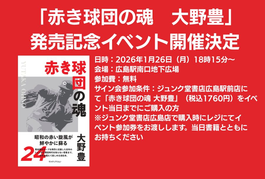 サイン会参加条件:ジュンク堂書店広島駅前店にて「赤き球団の魂 大野豊」(税込1760円)をイベント当日までにご購入の方