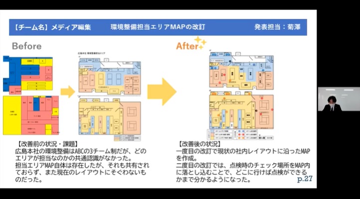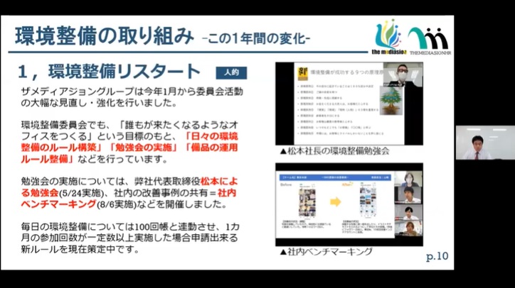 会社の「物」「情報」「人」に関して、働き易い環境を整えて常に備えておこうという取り組み「環境整備」。これを同門で勉強している会社同士、持ち回りで自社の取組を発表を担当し開催しているのが「広島武蔵野会」です。それぞれの会社が取り組んで成果が出たこと、効率が上がった事例などを共有し勉強をし合います。8月26日(木)に弊社がオンラインでこの1年の取り組みを発表、14社55名の方にご参加(ご視聴)頂きました。