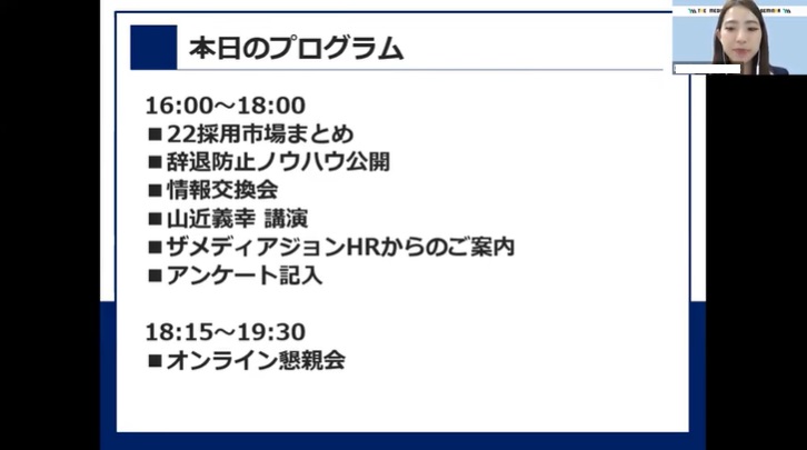 ザメディアジョンHRの新卒採用支援サービスを受けられているお客様だけがご参加できる「ザメディアジョンHR謝恩会セミナー」。毎年恒例で開催しておりますが、今年もオンラインで行わせていただきました。