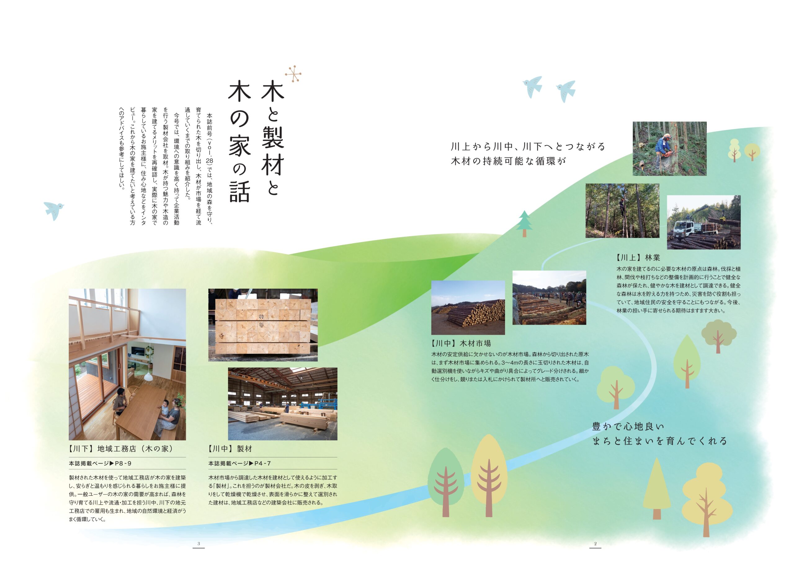 特集は、「木と製材と木の家の話」と題し、前号(「優しい木の住まいVOL.28」)に引き続き、地域の森を守り、木々を育て、流通させるまでの取り組みを知ることで、木の家に住むことの豊かさをより感じることができる特集となっています。 今号では環境への意識を高く持って企業活動を行う製材会社を取材。木が持つ魅力や木造の家を建てるメリットを再確認し、実際に木の家で暮らしているお施主様に、住み心地などをインタビューしています。