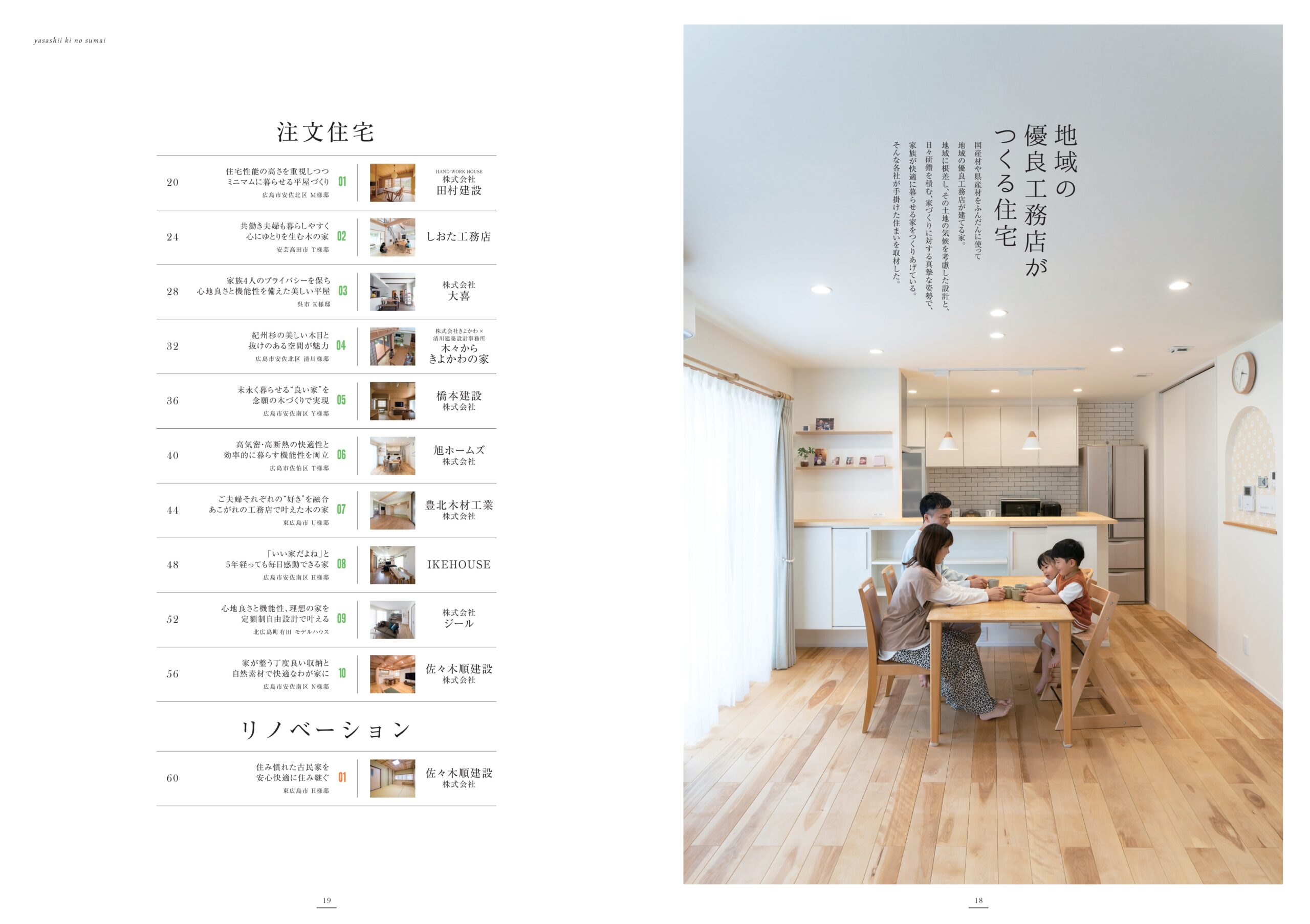 「優しい木の住まい」は、地域に密着した信頼と実績を持つ、地域工務店による木づくりの家を紹介しています。一般社団法人広島県工務店協会に属し、地域の復興住宅や耐震診断など家守りとしての活動を行う優良工務店を取材しています。
