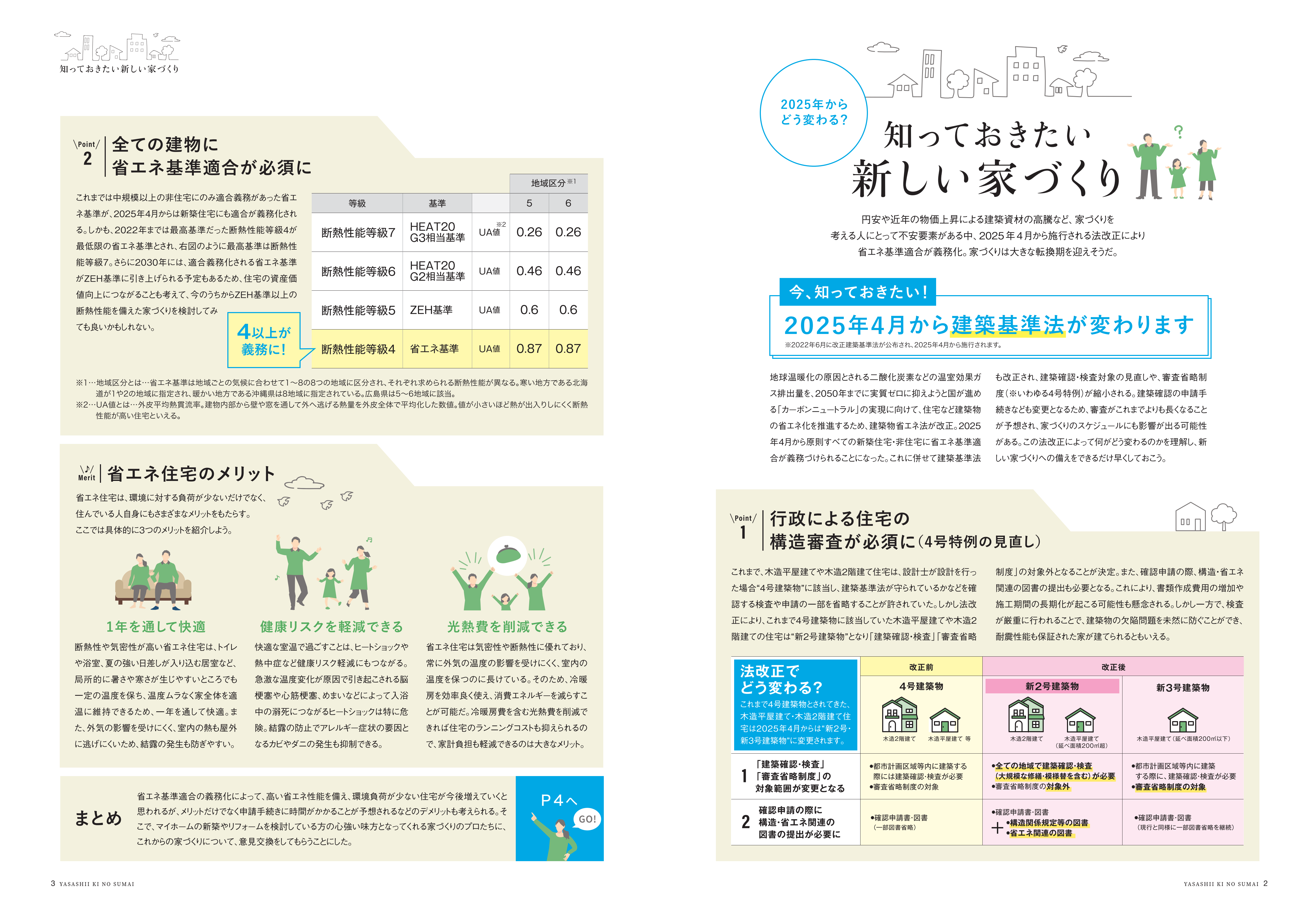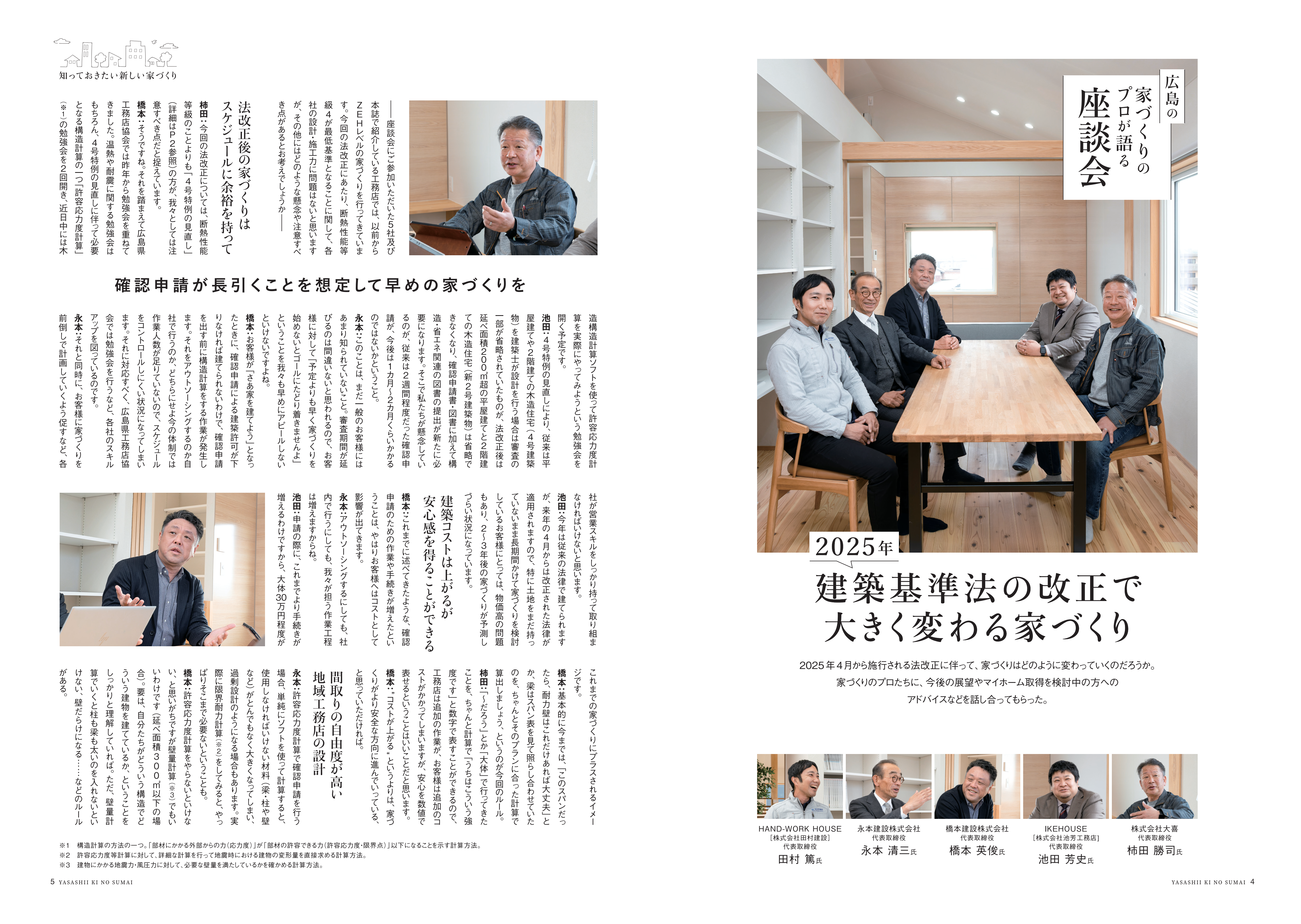 今号の特集は、「知っておきたい新しい家づくり」と題し、2025年4月から施行が開始される新しい建築基準法に関して、従来の法律からどのように変わるのか、新しい基準についてなどを紹介しています。さらに広島県工務店協会に属する家づくりのプロたちに集まってもらい開催した座談会の様子も掲載。今後の展望やマイホーム取得を検討中の方へアドバイスなどを話し合ってもらいました。家づくりを考えている方はぜひ参考にしていただければと思います。