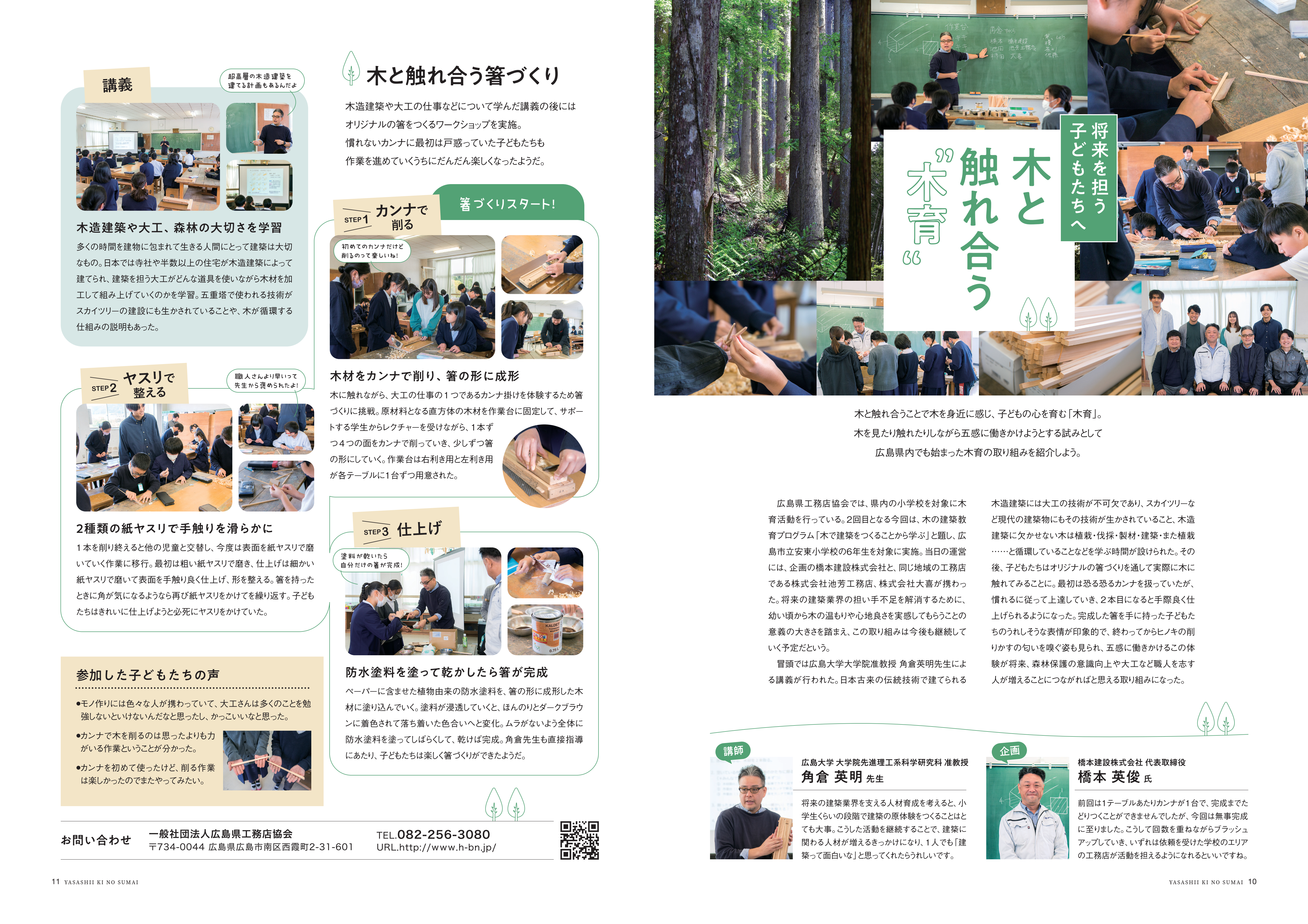 広島県工務店協会で行っている木育活動についても紹介。子どもたちが木と触れ合うことで、未来の森林保護への意識向上や大工などの職人を志す人が増えることにつながればと思いから開催。工務店協会所属の地域工務店と広島大学の教授と連携して行った木育活動の様子を紹介しています。