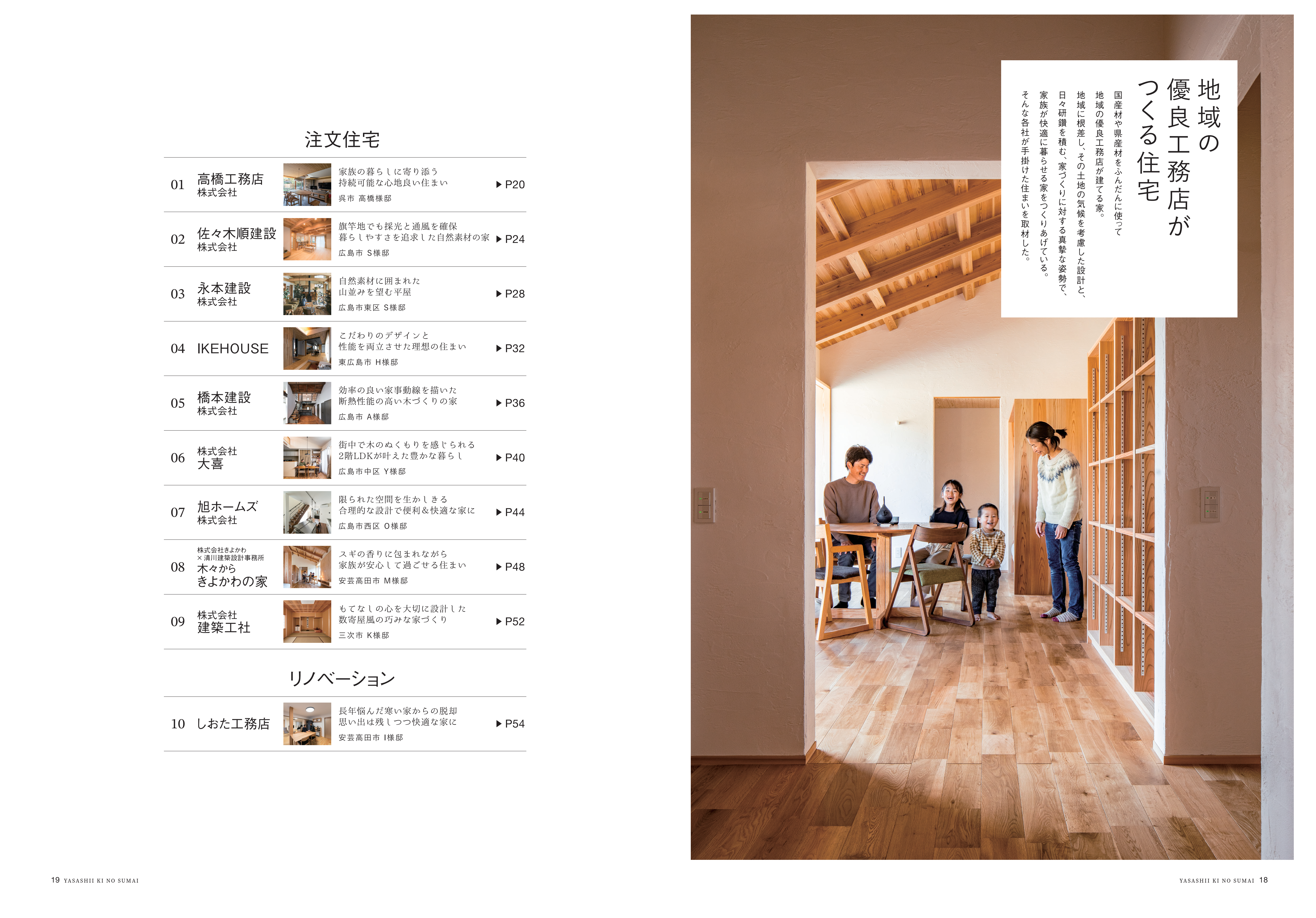 「優しい木の住まい」は、地域に密着した家づくりで信頼と実績を持つ、地域工務店が手掛けた木づくりの家を紹介しています。一般社団法人広島県工務店協会に属し、家づくりだけでなく、復興住宅の建設や耐震診断など家守りとしての活動を行う優良工務店を取材しています。