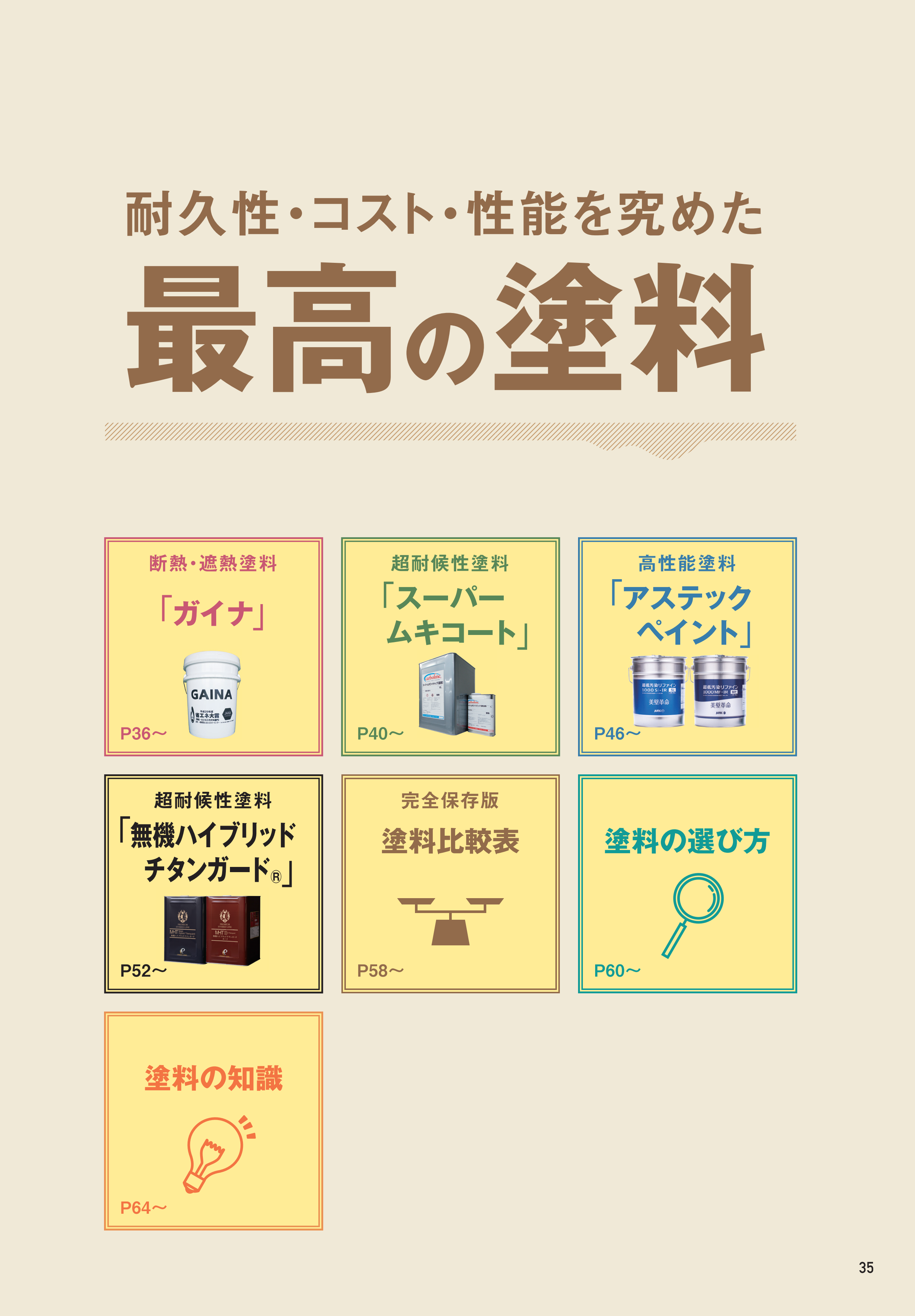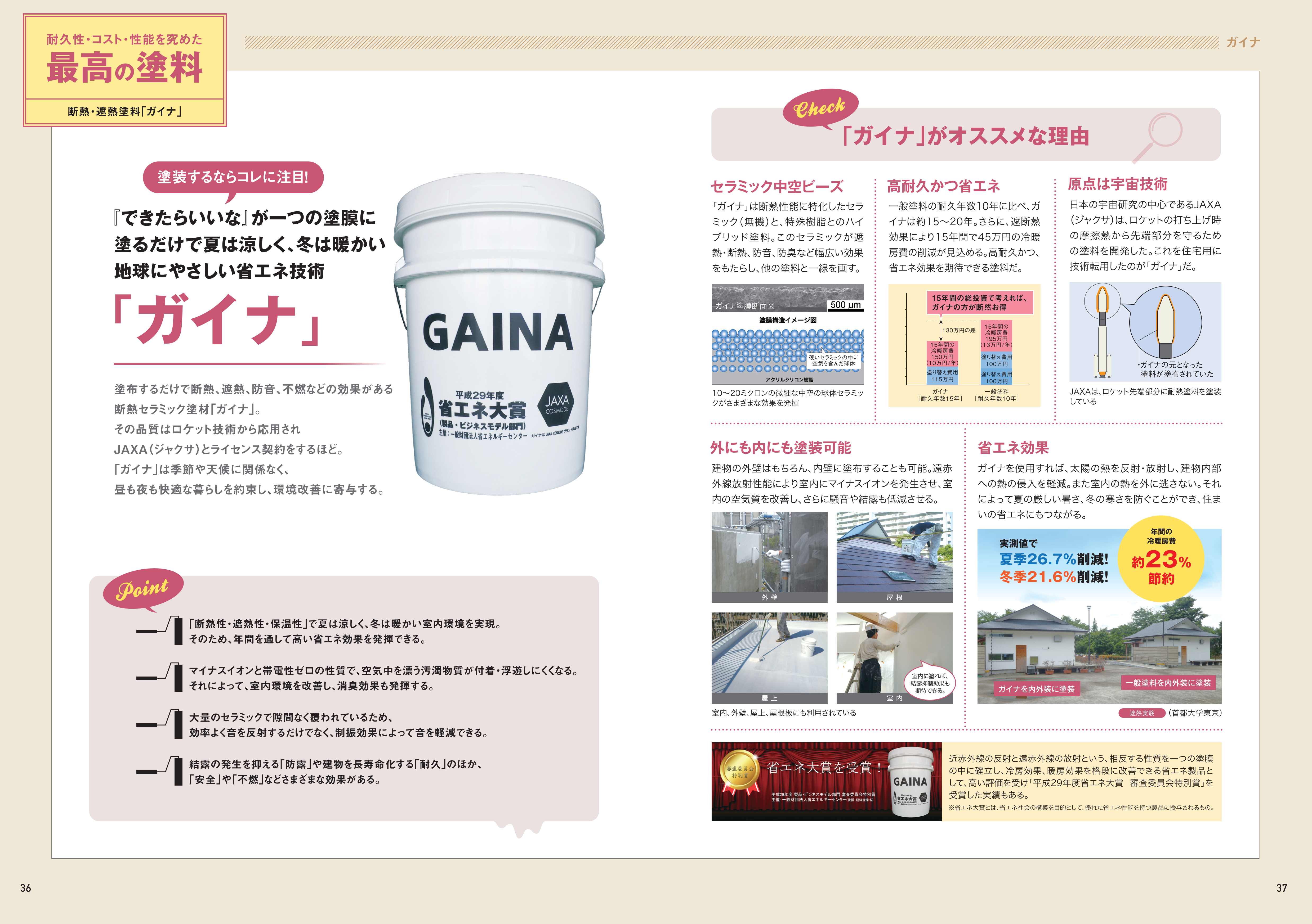 断熱・遮熱塗料「ガイナ」、超耐候性塗料「スーパームキコート」、美壁革命「超低汚染リファインシリーズ」、超耐候性塗料「無機ハイブリッドチタンガード」の4つの塗料をご紹介。その他、色選びの方法やカバー工法についても、分かりやすく解説している。