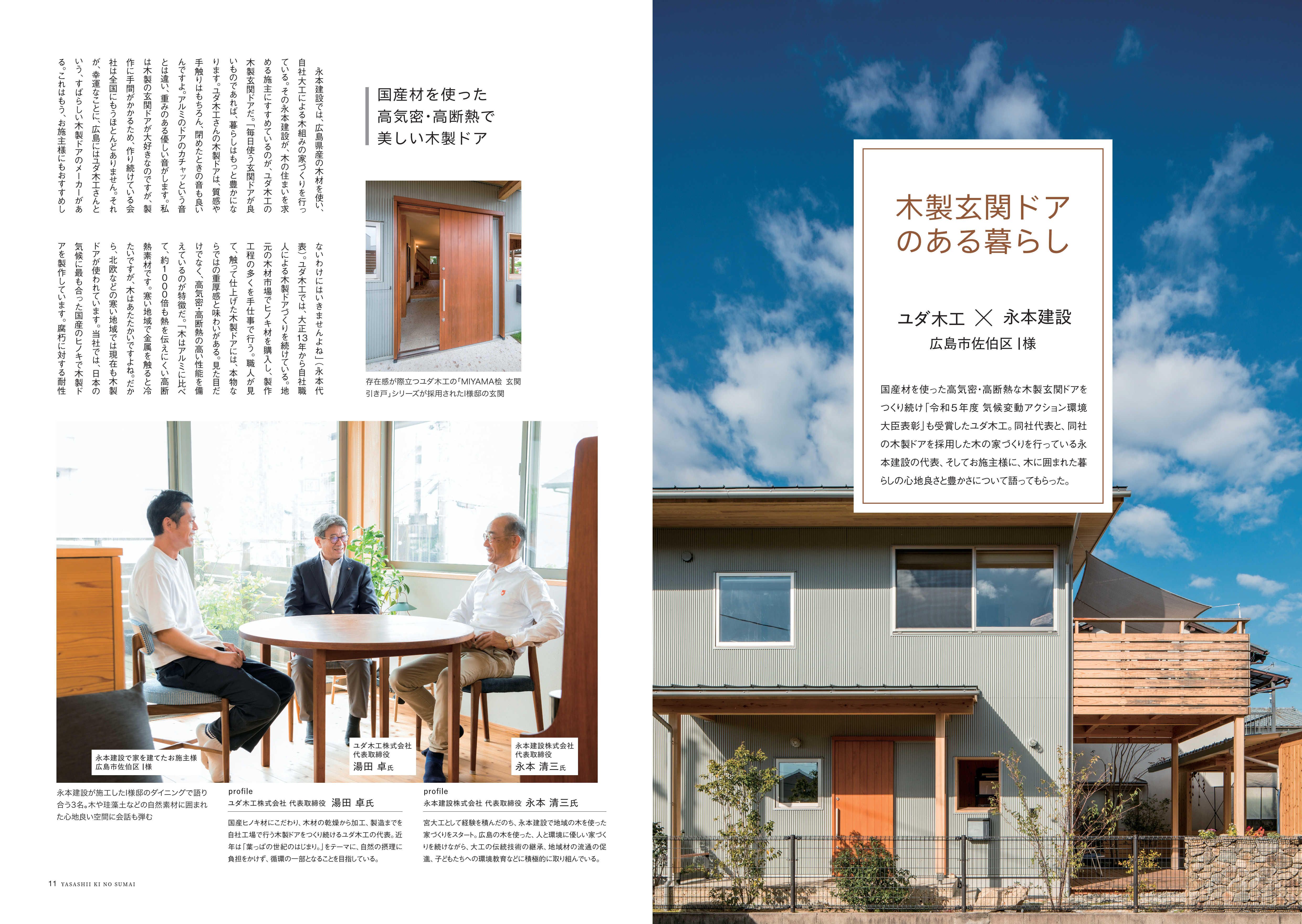 国産材を使った高気密・高断熱な木製玄関ドアをつくり続け「令和5年度 気候変動アクション環境大臣表彰」も受賞したユダ木工。同社代表と同社の木製ドアを採用した木の家づくり行っている永本建設の代表、そしてお施主様に、木に囲まれた暮らしの心地良さと豊かさについて語ってもらった。